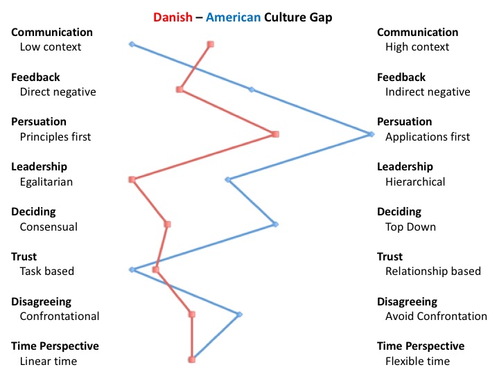 Although both Denmark and USA are task oriented, part of the reason people answer like that in these questionnaires is because they normally anticipate with reasonable accuracy how the other party in business will behave. When Danes and Americans make international business deals and realize that their predictions are not as accurate, suddenly they become a bit more relationship oriented as well. This even applies when doing business in other task based trusting cultures